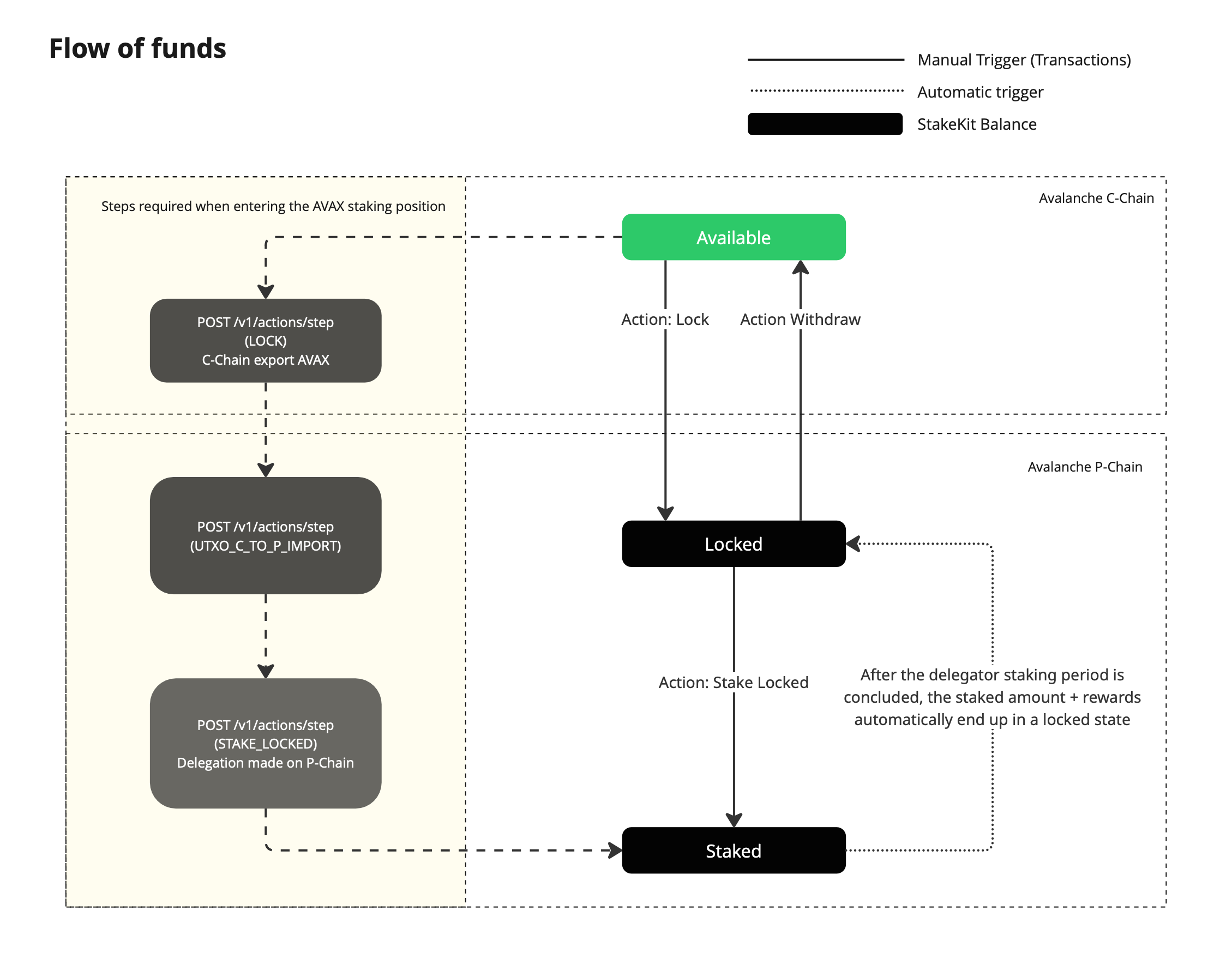 Important: staking is not a C-Chain smart contract call. AVAX staking uses C↔P atomic transfers plus a P-Chain delegation transaction.