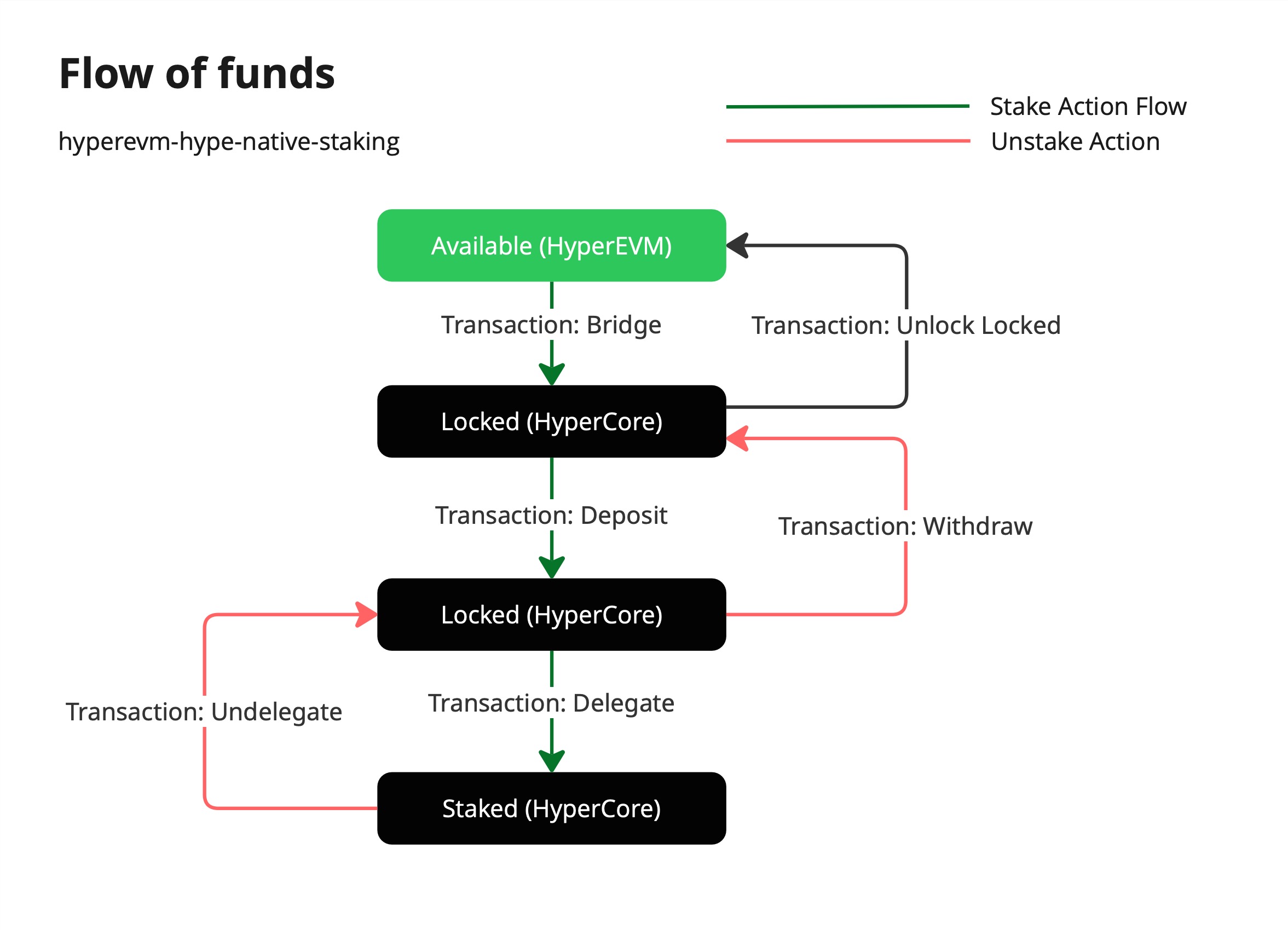 - CoreWriter – the contract that connects these layers, allowing EVM transactions to control staking, unstaking, and fund movement on HyperCore.