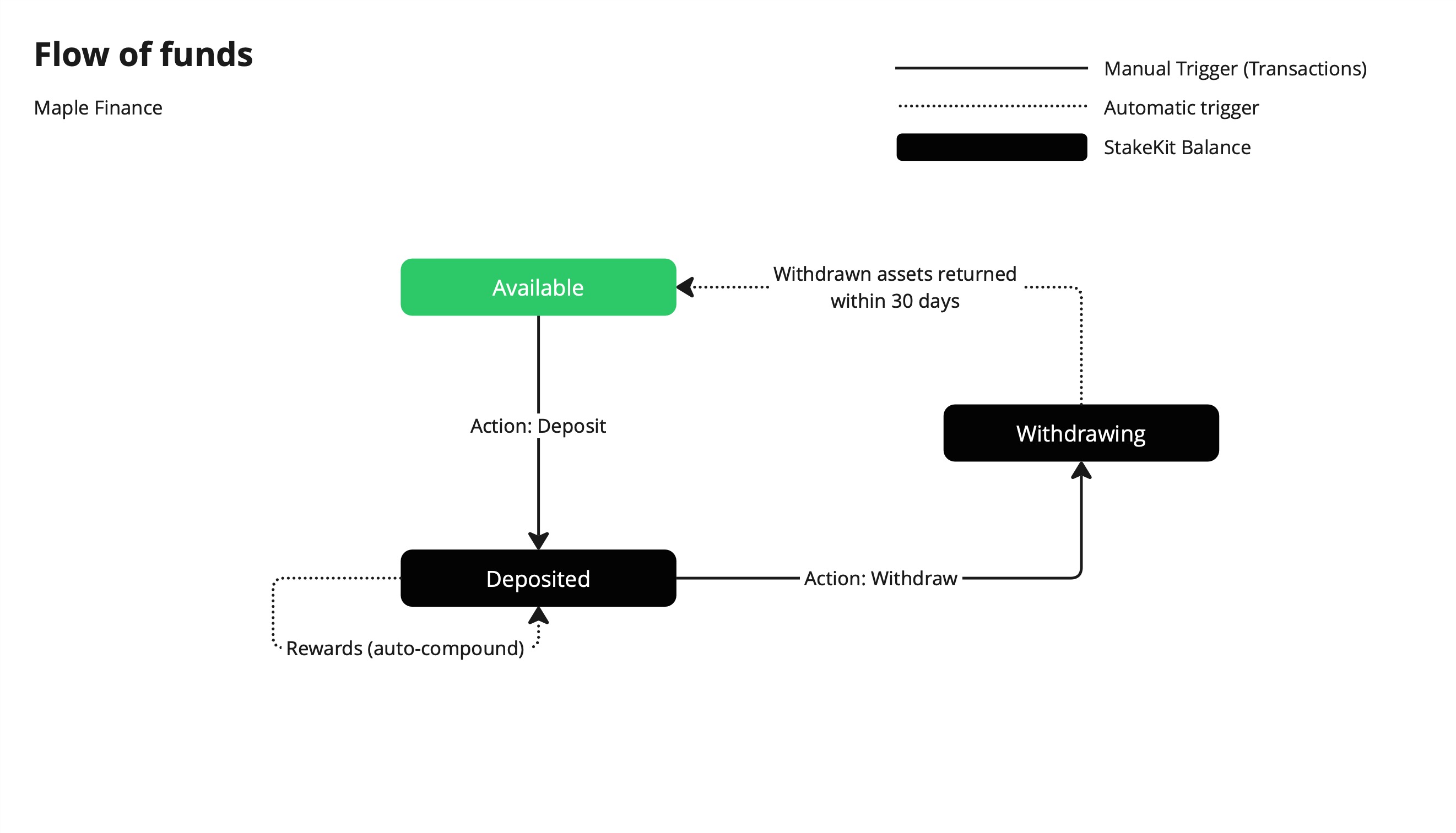 In addition to the base yield, users also earn Drips, Maple’s reward incentive mechanism that distributes protocol incentives to active lenders. Withdrawals are subject to a withdrawal period of up to 30 days based on available liquidity although most withdrawals are processed in under 24 hours. Following the completion of the withdrawal action, the withdrawal stays pending until sufficient liquidity is provided after which the withdrawn assets are transferred directly to the user's address. During the withdrawal period users continue earning yield.