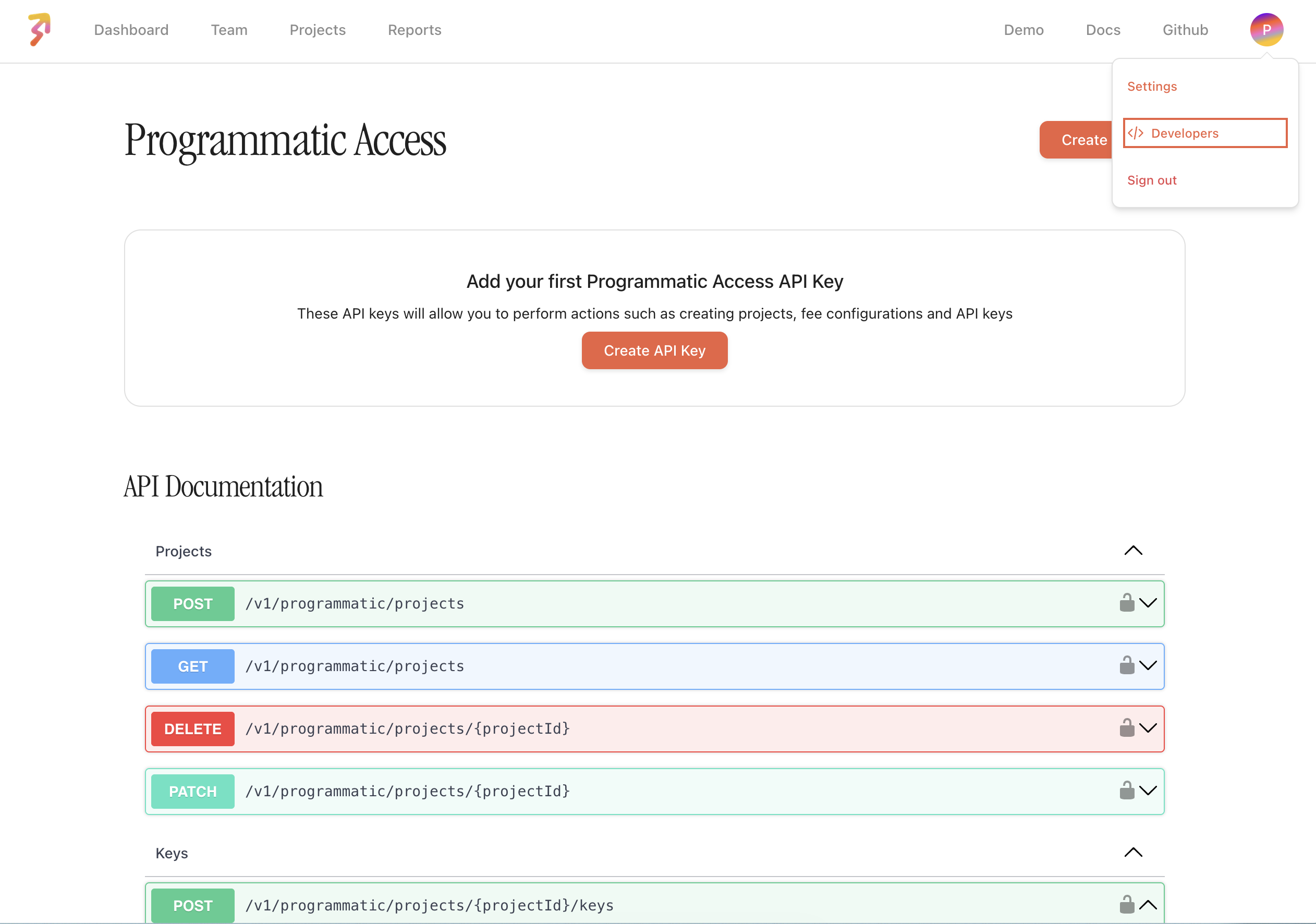 Automate project provisioning, API key management, yield enablement, fee configuration, and reporting through the Programmatic API