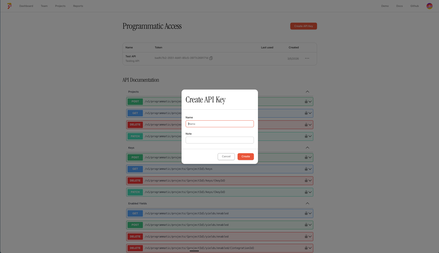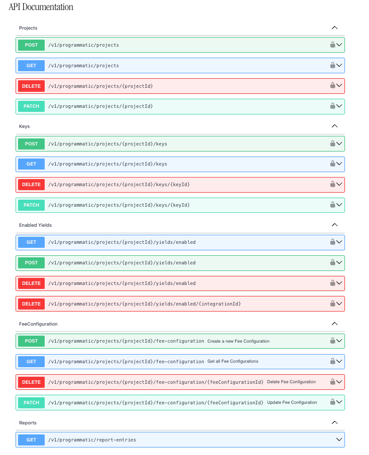 Guide to automating project management, API keys, yields, fees, and reports via the Programmatic API